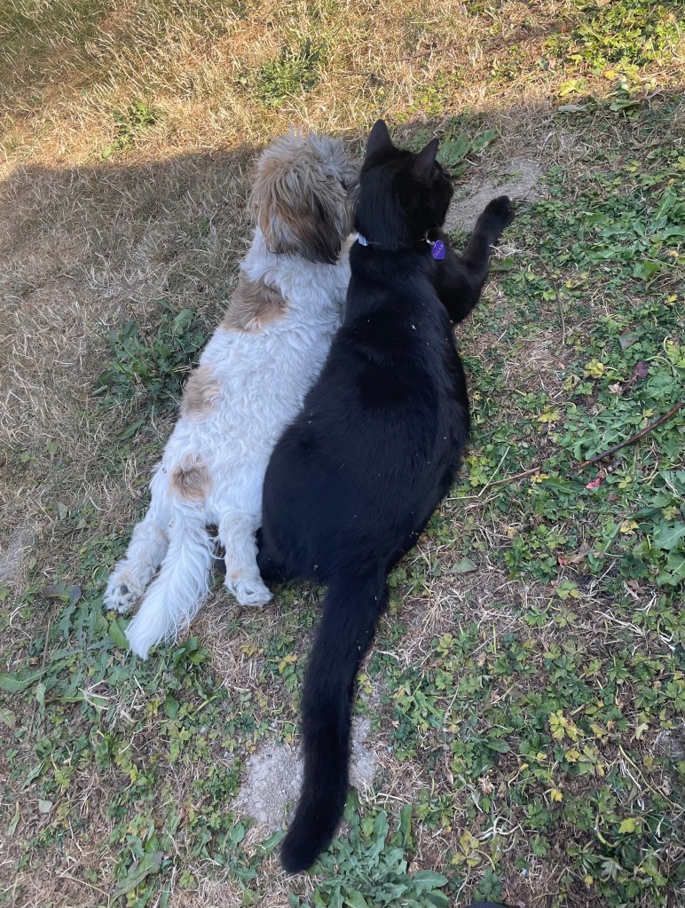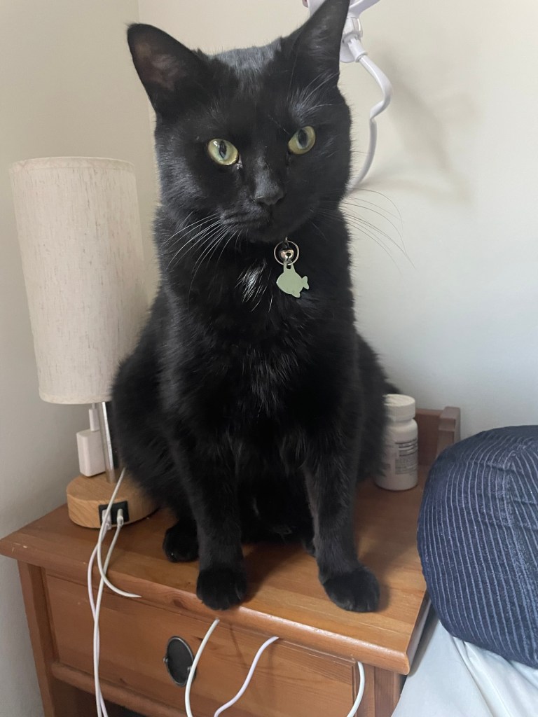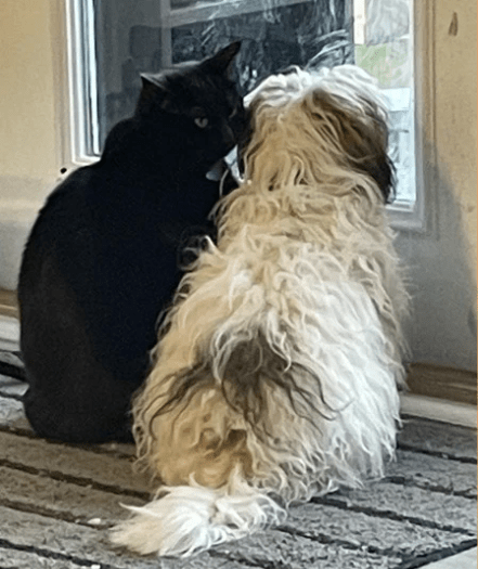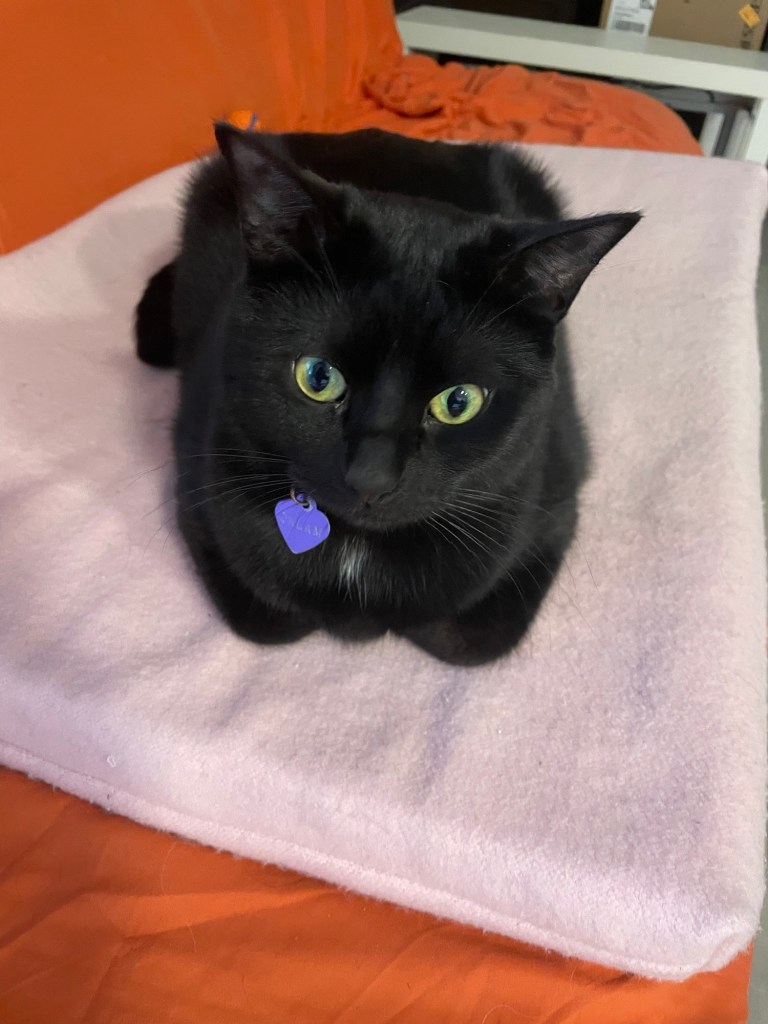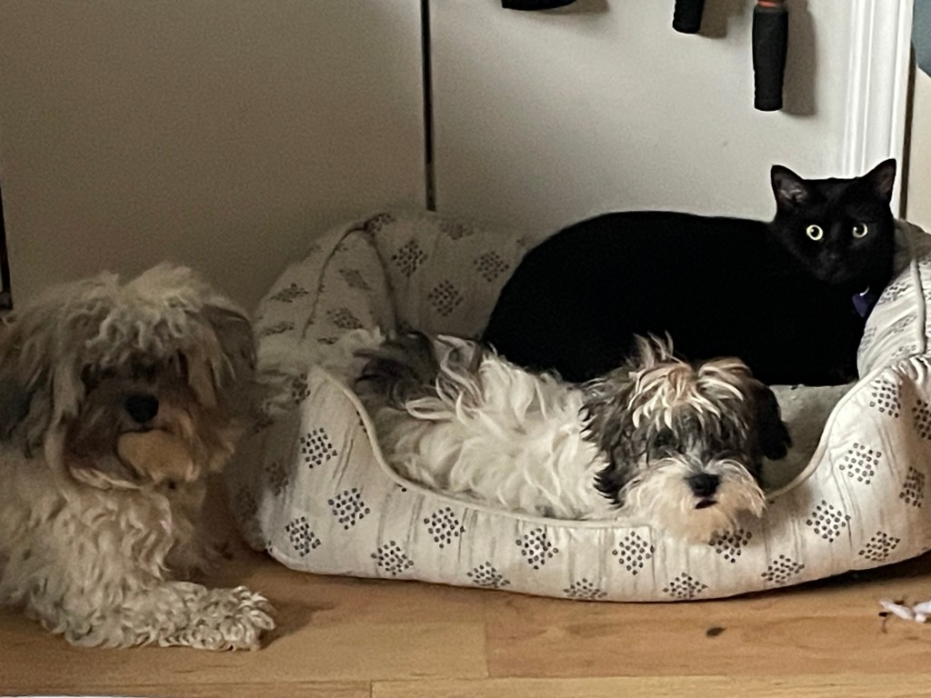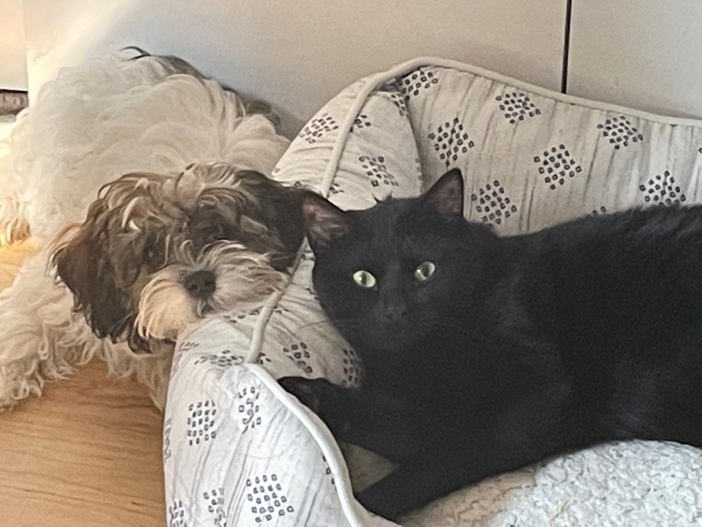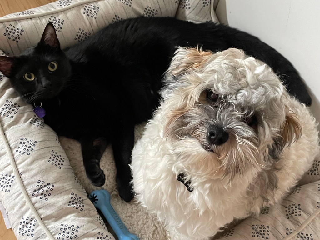 A custom made bed out of an old baby blanket. Looks so good with Calam’s shiny black coat.Calam in his hammockCalam loved to sleep on my pillow. He looks huge on my nightstand.Milo & CalamCalam’s dining chairGriffith (Milo’s Dad), Milo and CalamMilo & CalamCalam and GriffithGriffith & CalamBefore Milo timesCalam and Milo often slept beside each other. Milo thinks he’s a cat!Calam making plans with his bestie, MiloThe Boys!!! Calam, Milo and Griffith